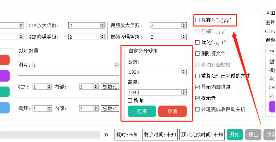 4.设置好降噪倍数和图片放大倍数以后,我们可以在自定义分辨率模块设置图片的分辨率,以及选择图片的保存格式。