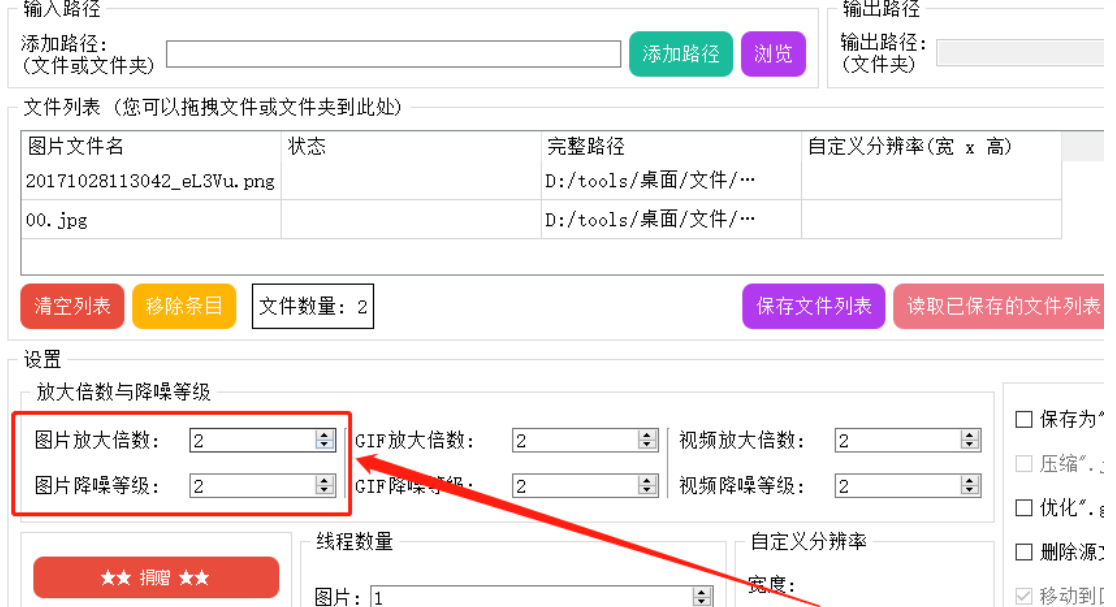 3.将需要放大的图片全部选择添加到软件界面之后,我们在设置模块中即可看到设置图片放大倍数和降噪等级的功能,我们可以根据自己的需求进行选择。
