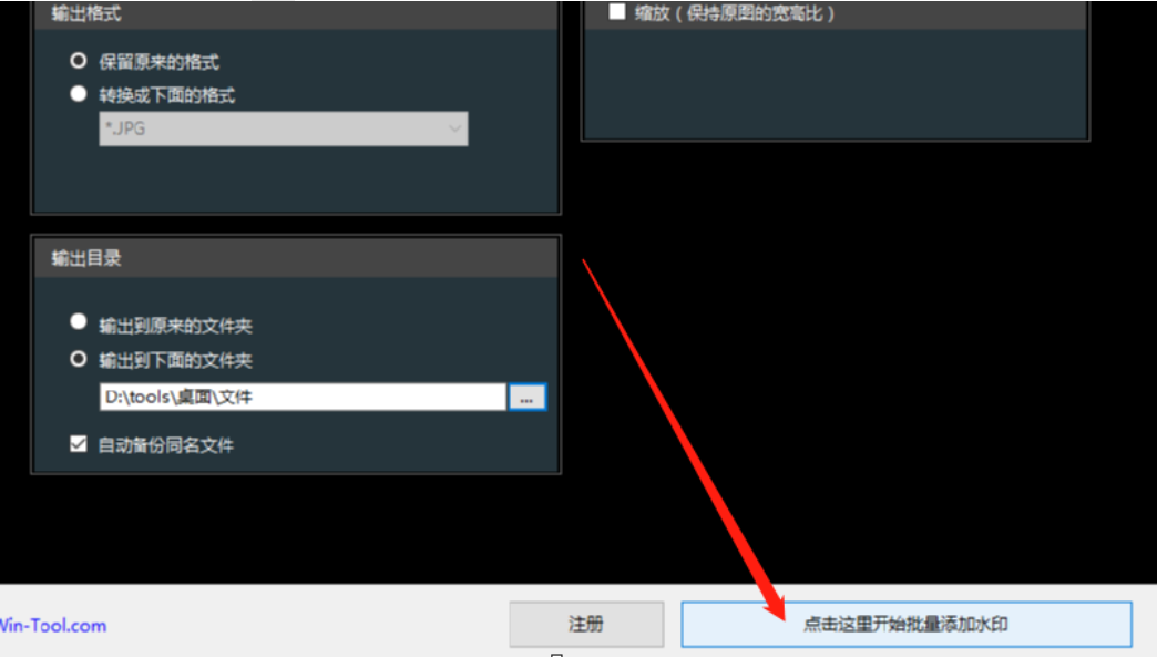 6.最后一步在我们设置好输出储存路径之后,我们点击界面下方的“点击这里开始批量添加水印”这个按钮就可以开始添加水印的操作了。