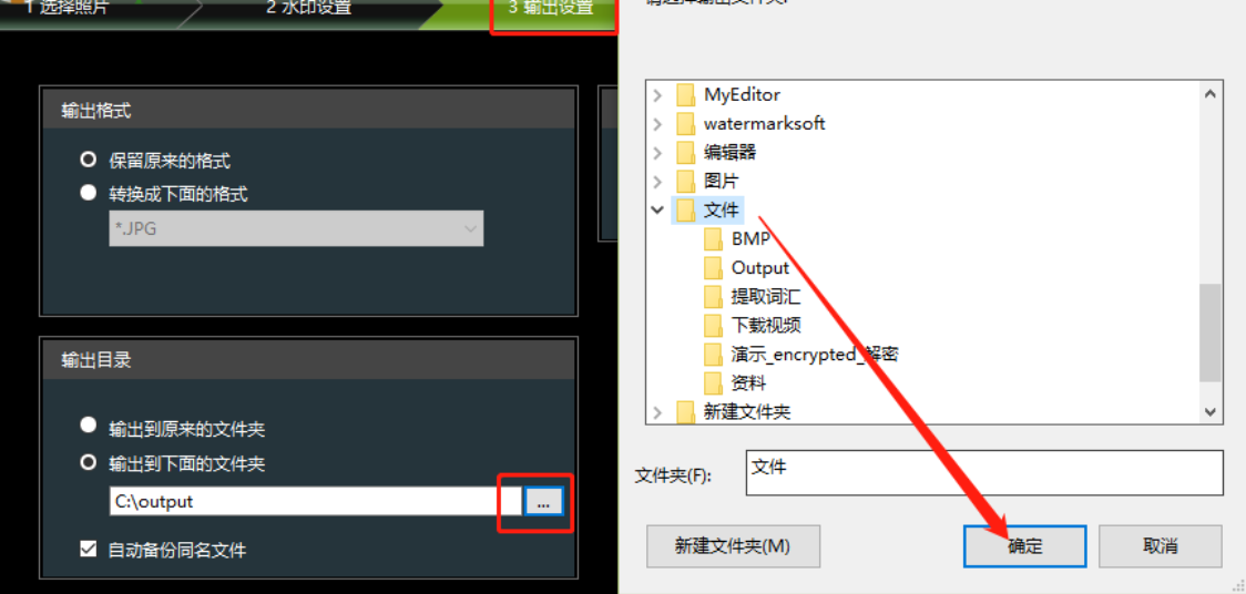 5.等到水印设置完成之后,我们点击切换到输出设置界面中,然后点击输出目录模块的三点按钮,点击之后即可选择文件的输出储存路径。