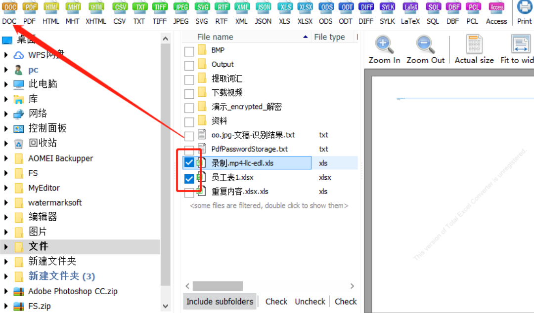 2.紧接着下一步我们勾选想要转换的Excel文件,然后点击界面左上角的Doc这个Word文件格式的选项。