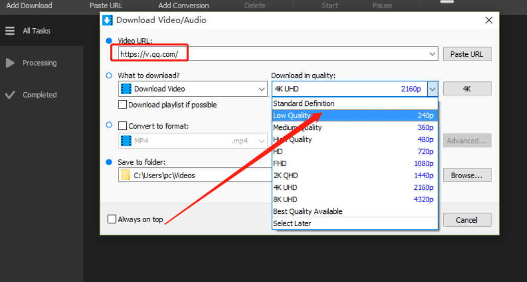 3.将目标视频的网页链接复制粘贴到地址栏之后,我们可以在下方的视频下载清晰度这里选择自己想要的视频清晰度。