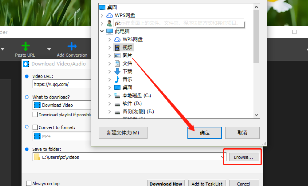 4.设置好视频下载清晰度之后,下一步点击储存文件后面的Browse这个功能按钮,点击之后在出现的界面中选择文件的输出保存位置。