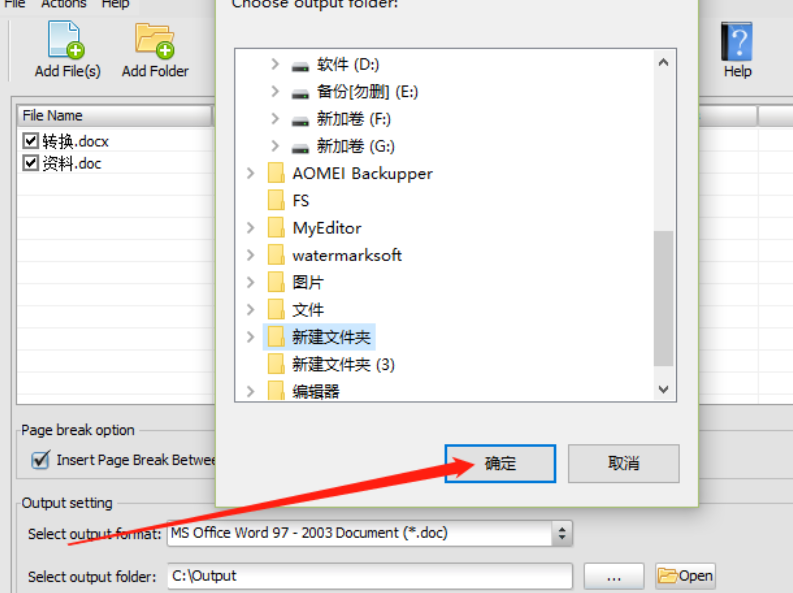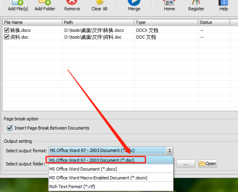 5.紧接着再下一步我们可以选择文件合并之后的输出格式,也就是一些Word文件类型的格式,大家可以根据自己的需求选择。