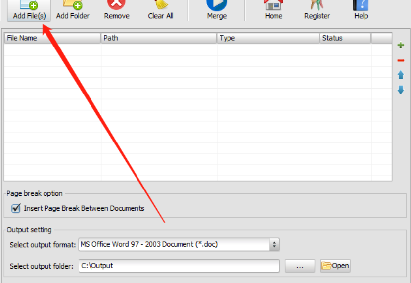 1.首先第一步我们打开软件之后在界面左上角点击Add按钮,点击之后即可添加需要合并的Word文件。