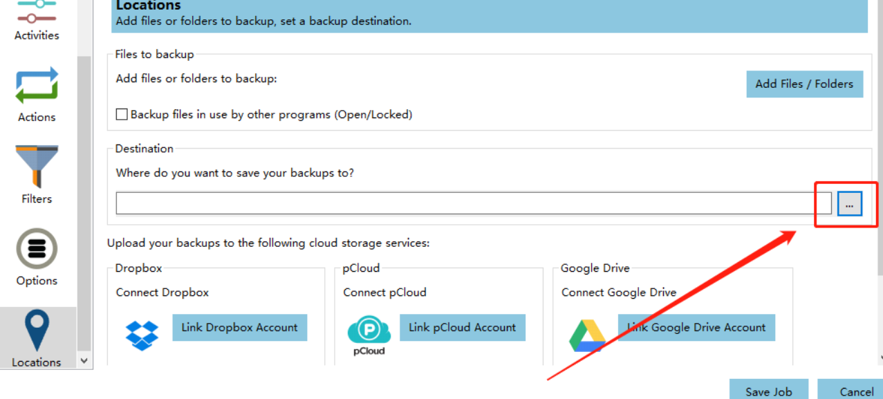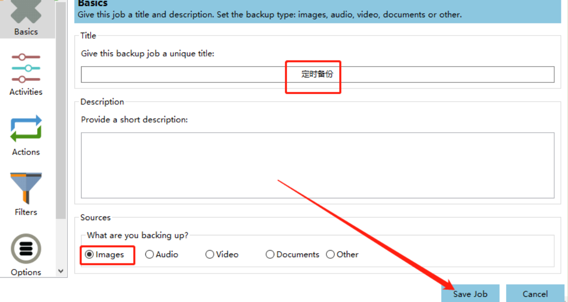 2.点击添加备份任务这个功能之后,我们需要在出现的界面中设置备份任务的名称,以及选择想要备份的文件类型,设置之后点击Save Job按钮。