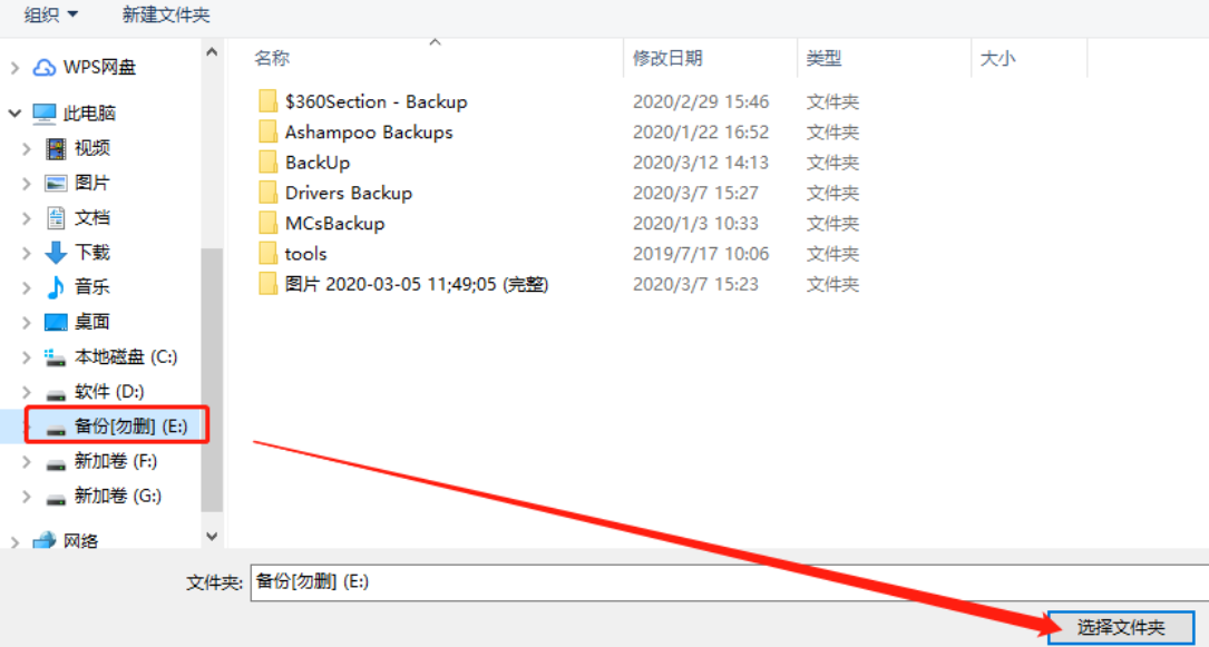 6.同样的在打开选择备份目标文件夹的界面之后,我们选中想要储存备份的文件夹路径,然后点击选择文件夹按钮。