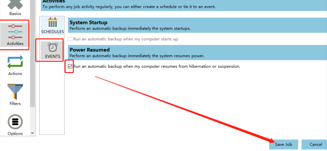 7.最后一步我们就可以在编辑任务的界面中,切换到Activities这个模块,然后点击EVENTS这个功能,然后勾选Power Resumed这个选项了,勾选之后就会在电脑开启之后进行自动备份。