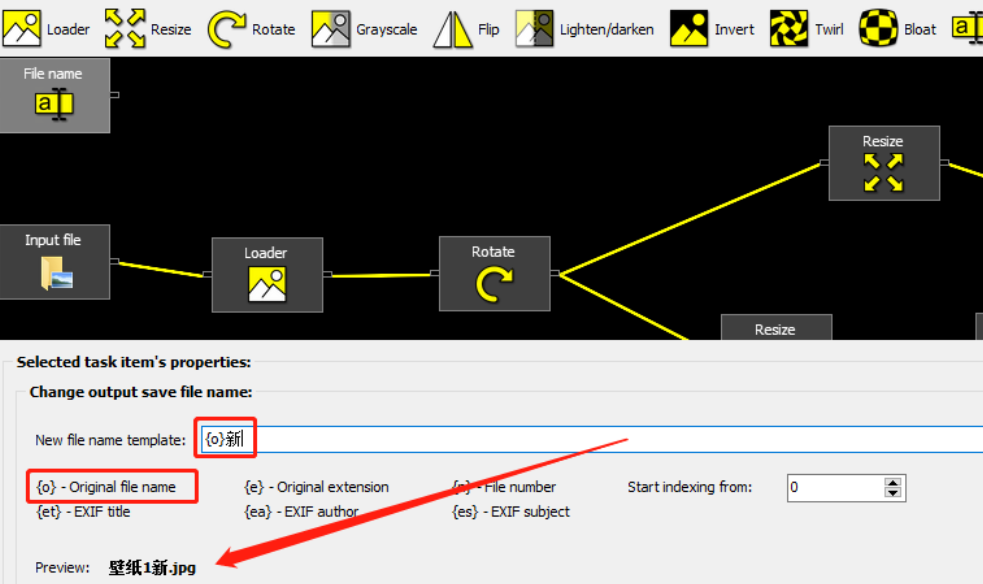 5.小编使用“{O}”这个规则,表示在文件名称的后面添加修改,小编就以这个规则为例来跟大家演示,在后面输入想要添加的名称内容,在左下方可以预览重命名之后的效果。