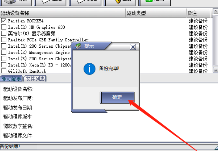 3.点击确定按钮之后软件就会自动开始备份驱动了,等到备份完成之后在界面中会出现一个备份完毕的提示界面,如下图中所示。