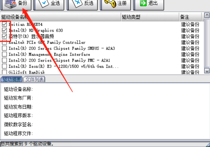 1.首先第一步我们打开软件之后在界面中可以看到识别出来的一些驱动程序,然后我们勾选想要备份的驱动程序之后点击上方的备份按钮。