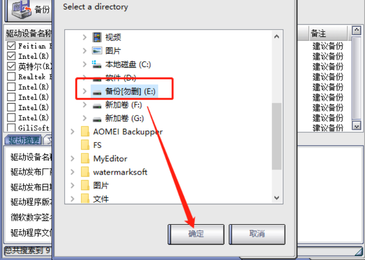 2.点击备份按钮之后接下来会出现一个选择保存驱动程序的文件的界面,在其中我们选中想要储存驱动程序的位置之后点击确定按钮即可。