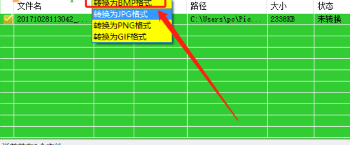 3.点击打开按钮之后我们选择的图片就成功添加进来了,然后下一步就是设置我们想要转换的目标格式,打开下拉列表之后选择转换为BMP格式。