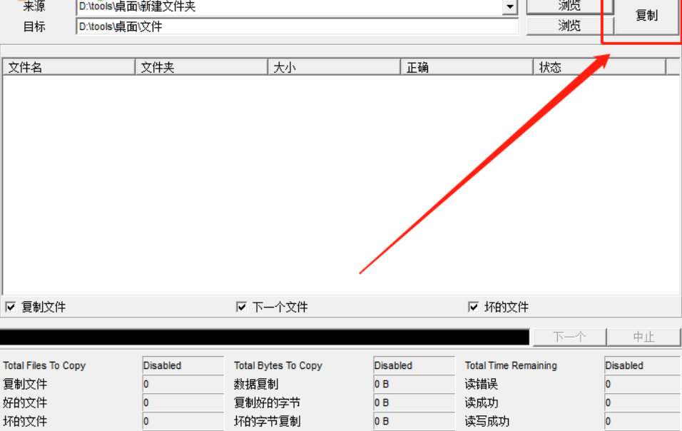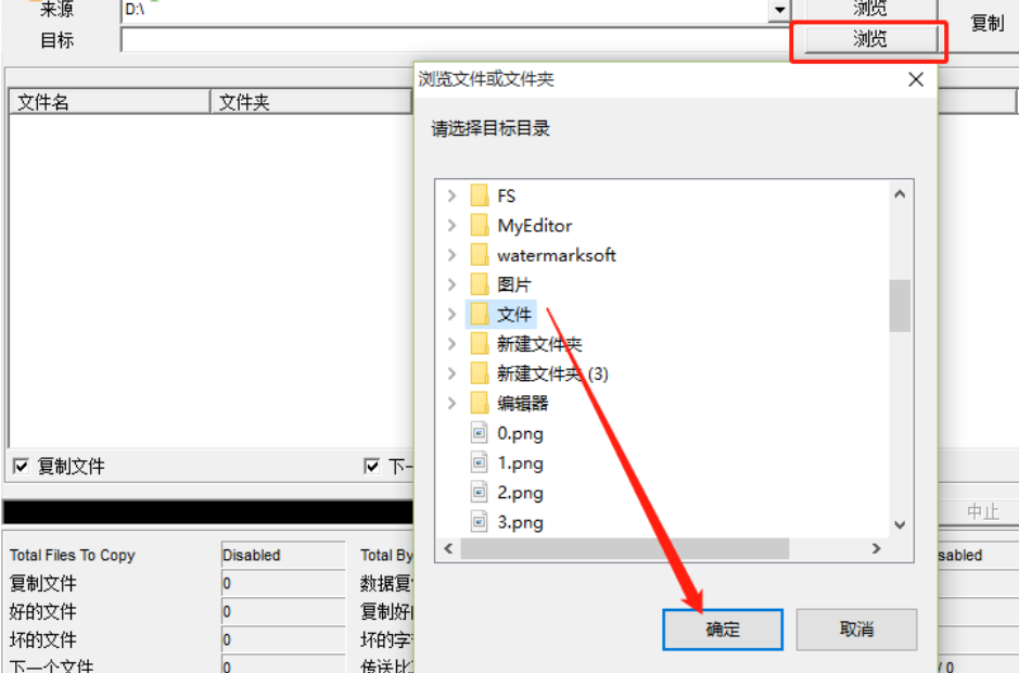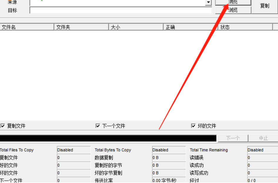 3.选择想要复制修复的文件之后,下一步就是点击目标选项后面的浏览按钮,点击这个浏览按钮可以选择文件修复之后的复制保存地址。