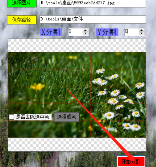 5.设置好分割图片的一些数值之后,我们在图片中可以看到一些红色的辅助线,预览分割的效果,最后点击右下角的开始分割按钮即可开始分割图片。