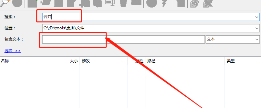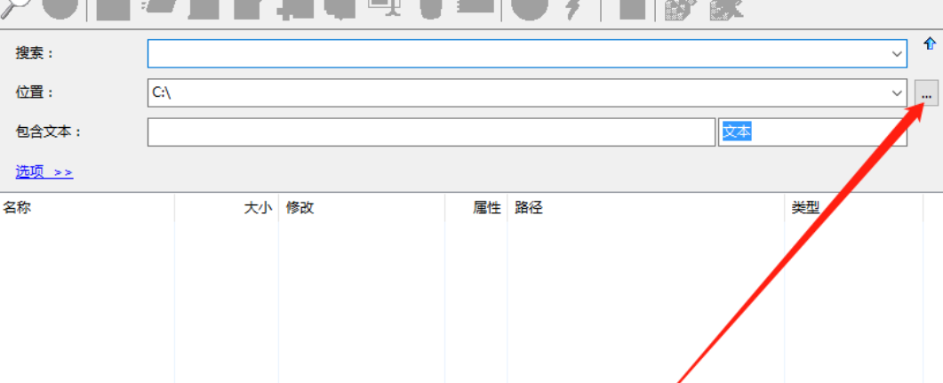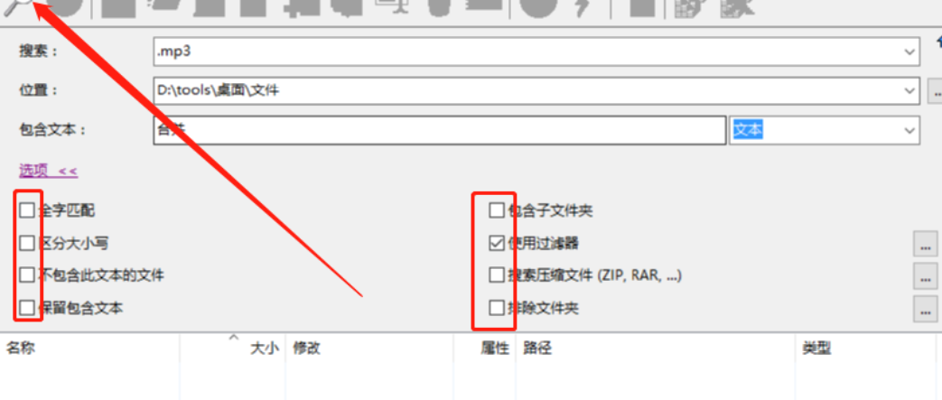 5.最后一步我们在打开选项,然后设置好自己想要使用的一些搜索选项之后,点击界面左上角的放大镜图标就可以开始搜索文件了。
