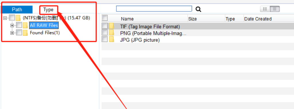 3.等到扫描完成之后在软件界面的左边就可以看到扫描出来的一些文件列表了,可以选择根据路径来显示或者根据类型来显示。