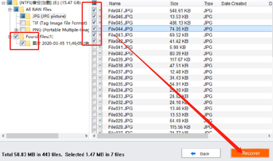 4.我们在这些文件夹中找到想要恢复的文件之后勾选上这些文件,然后点击界面右下角的Recover这个恢复按钮就可以恢复选中的文件了。