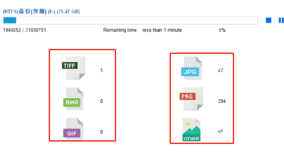 2.点击Scan按钮之后软件就会自动开始扫描这个磁盘中可以恢复的图片文件了,我们在界面中可以看到扫描进度。
