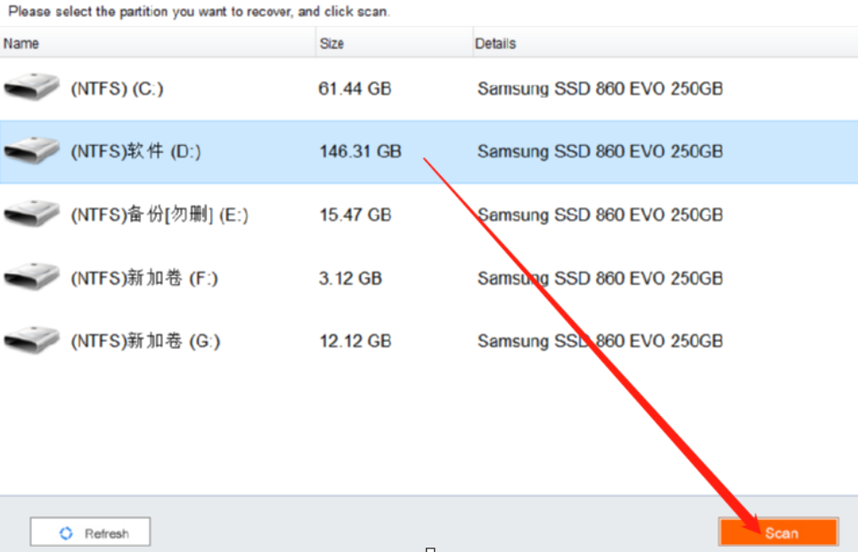 1.首先第一步我们打开软件之后在软件主界面中选中想要扫描恢复文件的磁盘,选中之后点击界面右下角的Scan按钮。