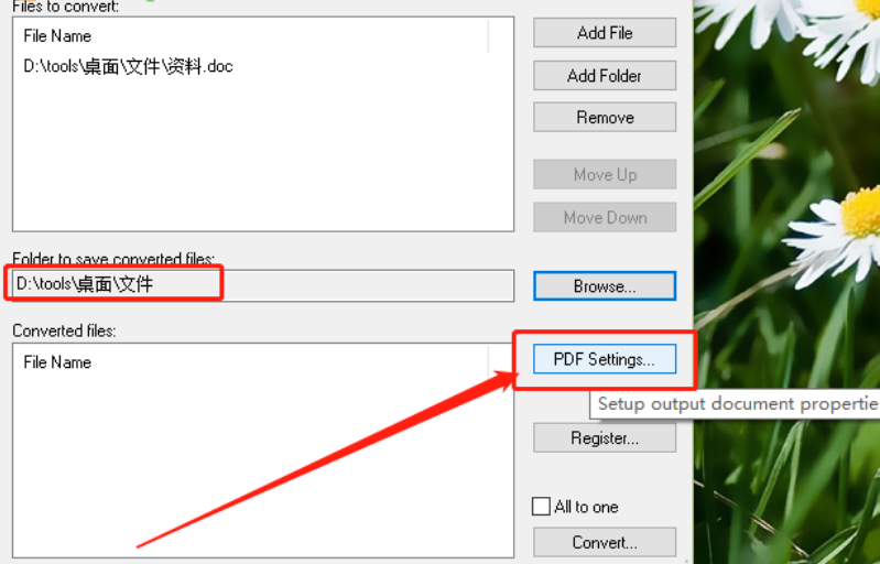 4.设置好输出路径之后,下一步是点击界面中的PDF Settings这个设置按钮,点击即可打开设置PDF文件的界面。