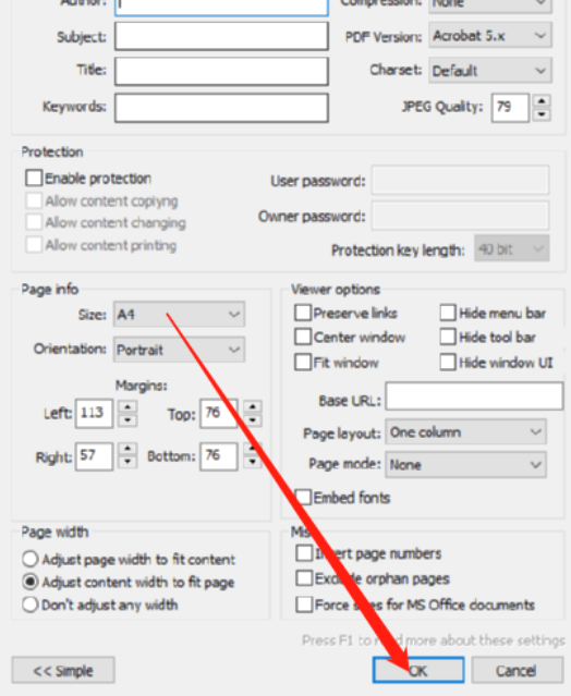5.打开设置PDF文件界面之后,我们可以对PDF文件的信息、图片质量、页面宽度等参数进行自定义设置,用户根据自己的需求设置即可。
