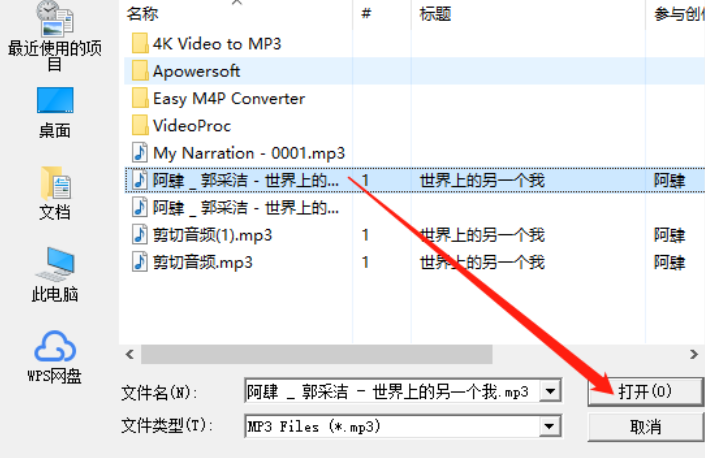 2.点击添加音频按钮之后,会打开一个选择文件的界面,在这个界面中我们选中目标音频文件之后点击右下角的打开按钮。