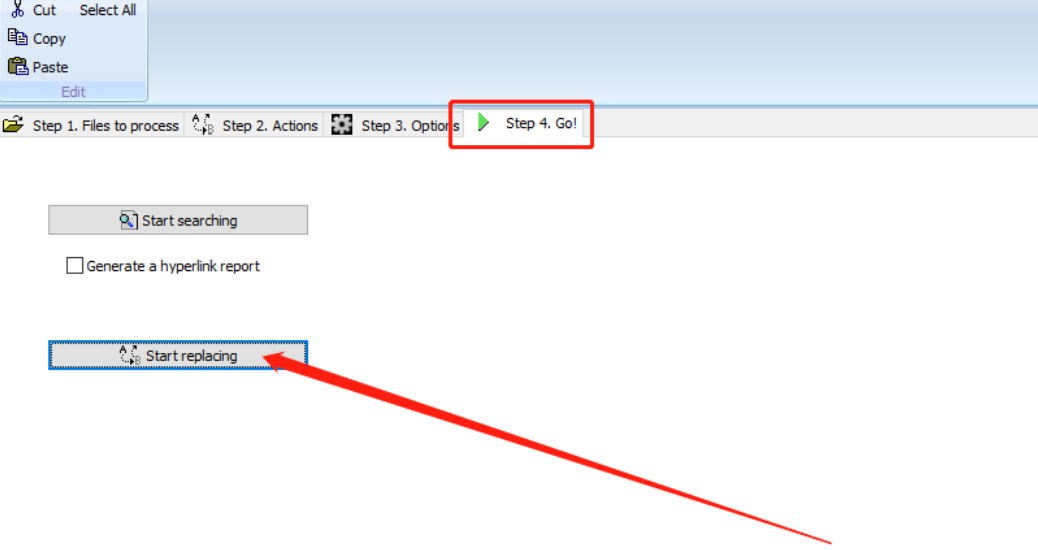 5.最后我们根据自己的需求设置好替换参数之后,切换到最后一步“Step 4.Go!”界面中,然后点击“Start replacing”按钮即可开始替换PPT文件内容。