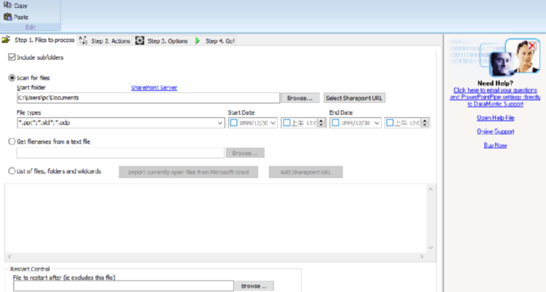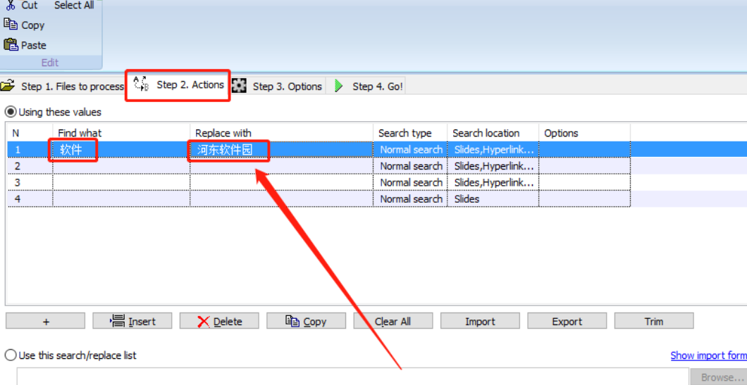 3.设置好查找PPT文件的文件夹和类型之后,下一步切换到设置界面,也就是“Step 2.Actions”界面中,然后在这个界面我们就可以输入要查找什么内容以及将查找内容替换成什么内容了,根据用户的具体需求设置即可,如下图中所示。
