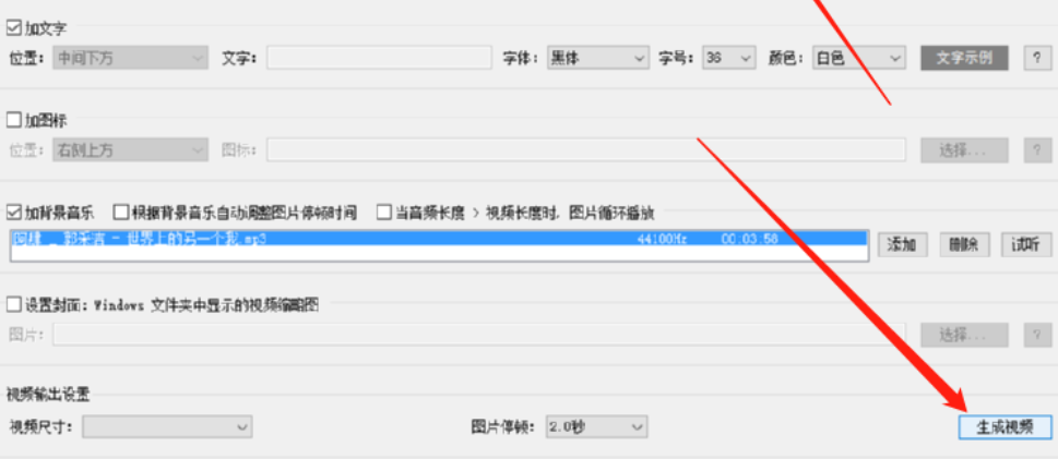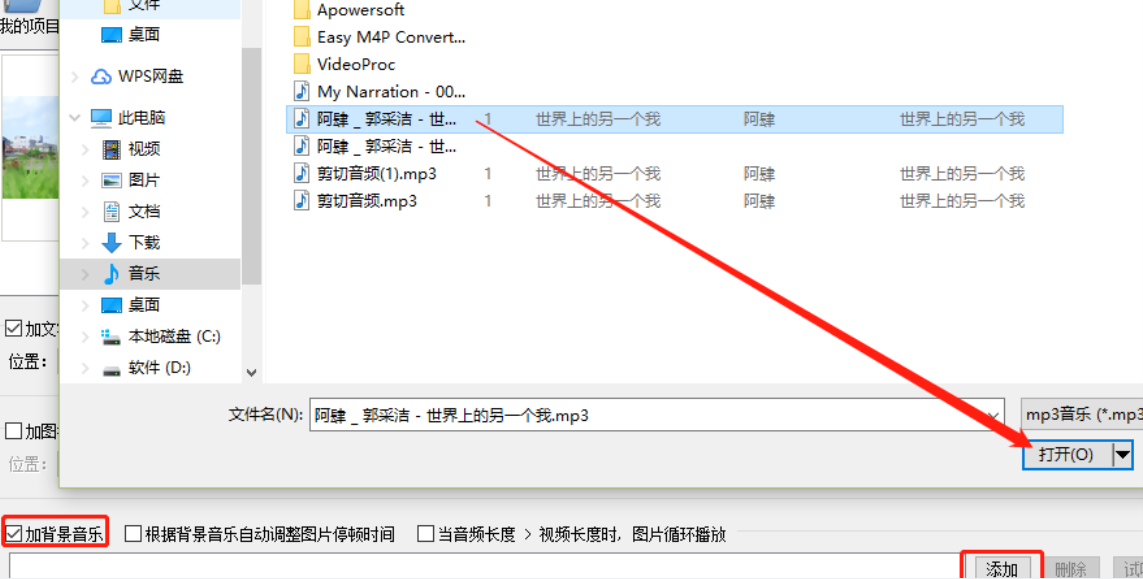 4.紧接着下一步我们找到加背景音乐这个功能,点击勾选这个功能之后再点击添加按钮,点击这个添加按钮即可选择想要添加到相册中的背景音乐。