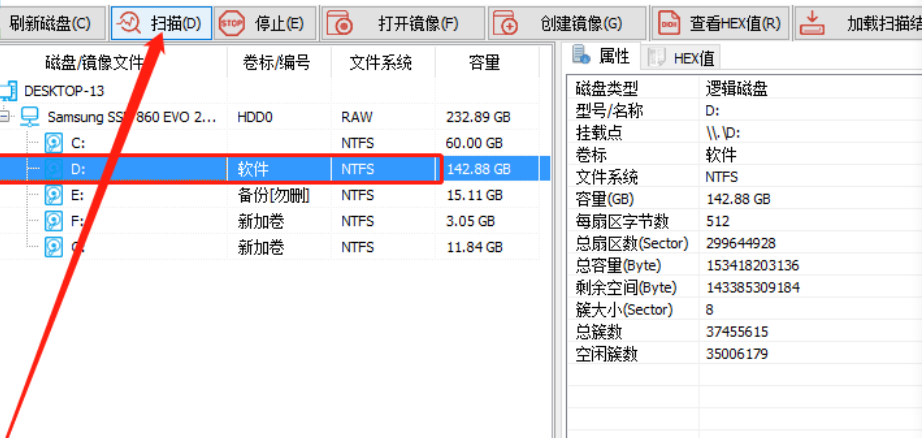 2.进入到恢复视频的界面之后,我们在界面中需要先选择想要恢复视频的磁盘,选中之后点击上方的扫描按钮开始扫描。