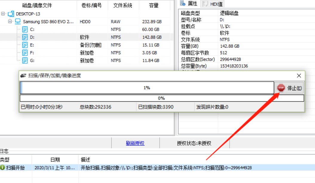4.选择好扫描路径之后软件就会自动开始扫描操作了,在界面中会显示一个扫描进度,点击后面的停止扫描按钮可以停止扫描。