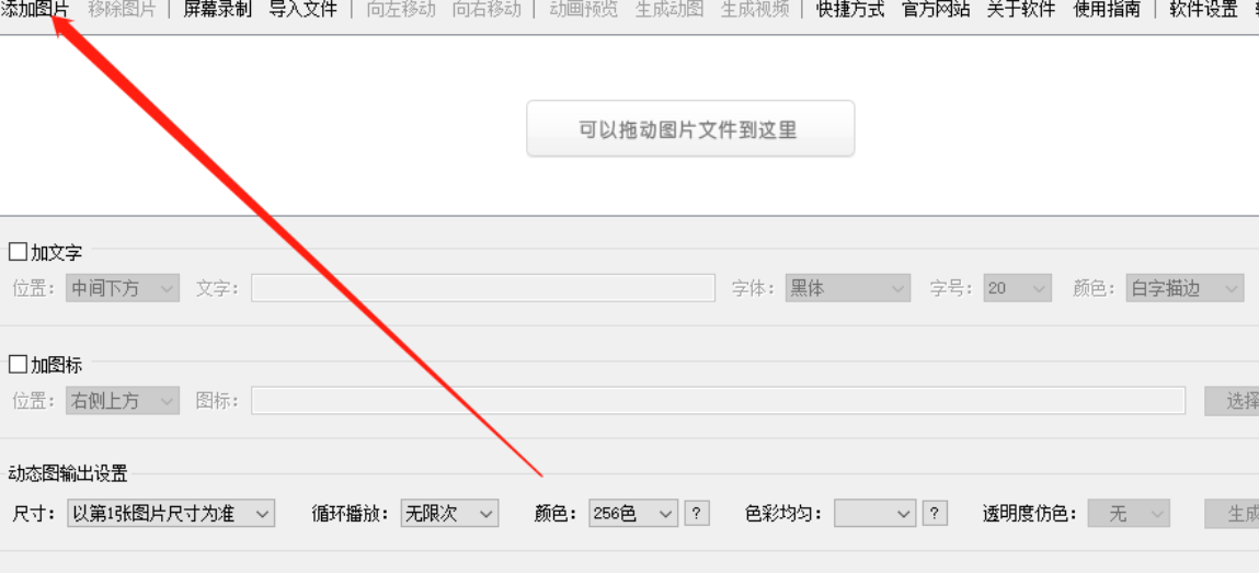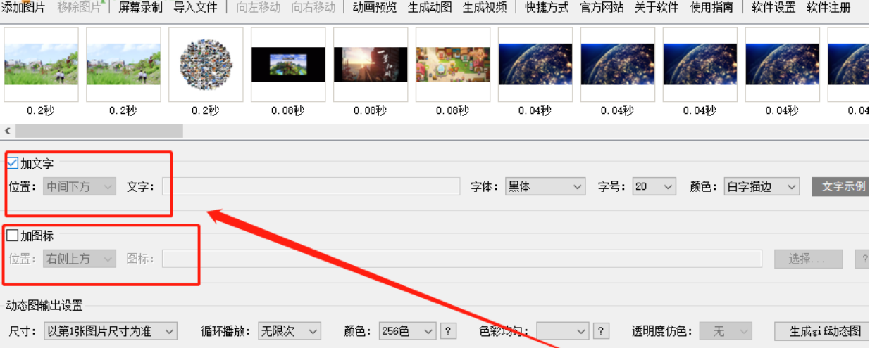 3.点击打开按钮之后图片就被全部添加到软件里面了,然后我们可以在界面中使用加文字、加图标这两个功能来设计我们的GIF图片。