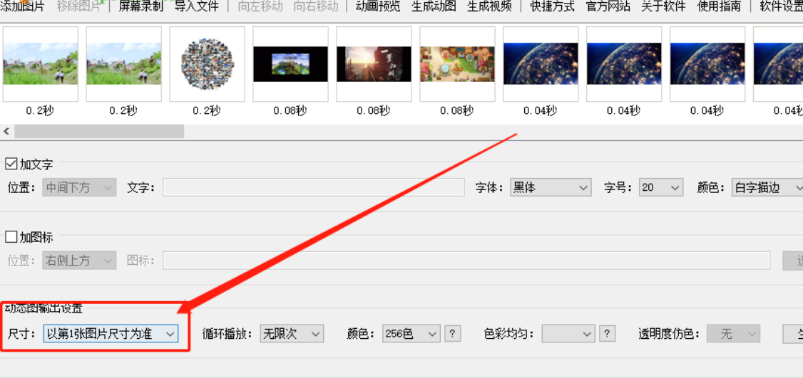 4.紧接着下一步在动图的输出设置模块中我们可以选择图片的尺寸标准,因为我们添加的图片大多都是不同的尺寸,这样的话就可以通过这个功能来规范图片尺寸了。