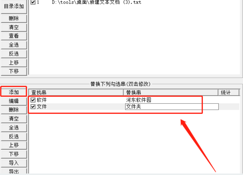 3.点击打开按钮之后下一步在下方的替换功能模块中点击添加按钮,点击之后就出现了一个设置查找字符串和替换字符串的界面,如下图中所示。