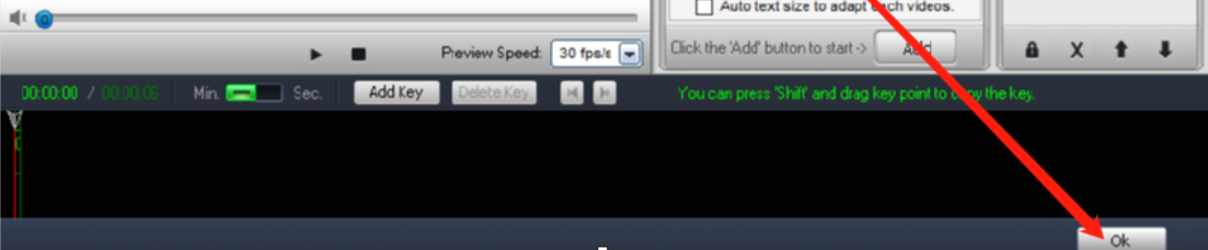 6.点击添加按钮之后设计好的水印就成功添加进来了,在左边列表中可以看到水印选项,在右边视频界面中可以预览水印内容,然后点击右下角的OK按钮。