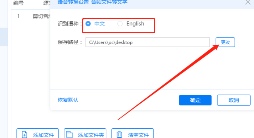 4.点击这个齿轮图标之后我们在界面中就会看到一个设置窗口了,然后在这个窗口中我们可以点击选择识别语音文件的语种,然后点击更改按钮。