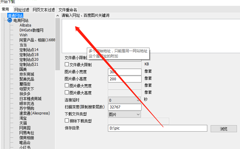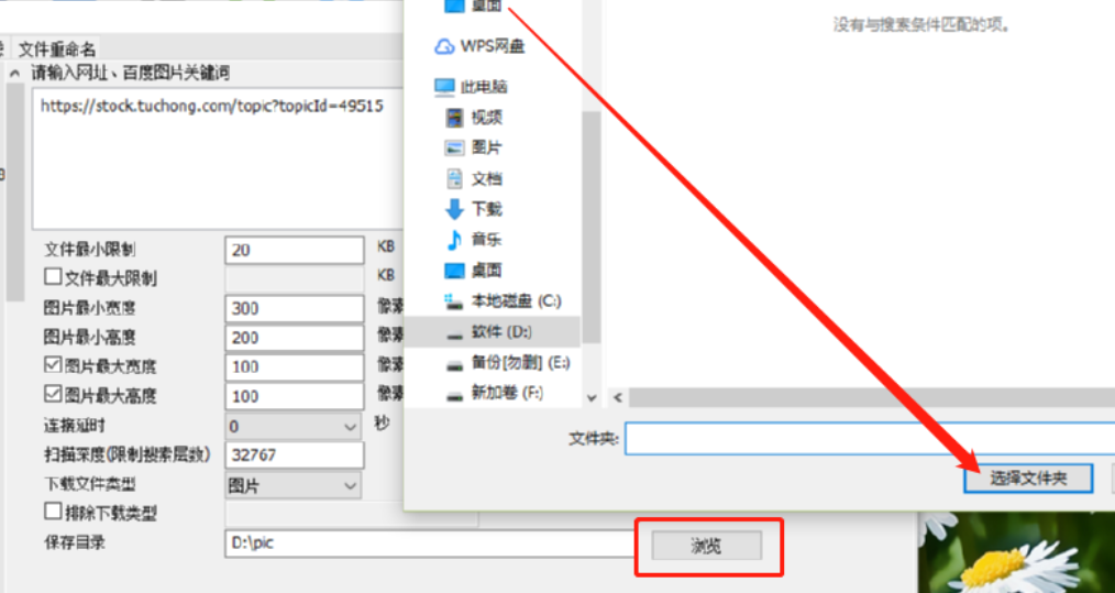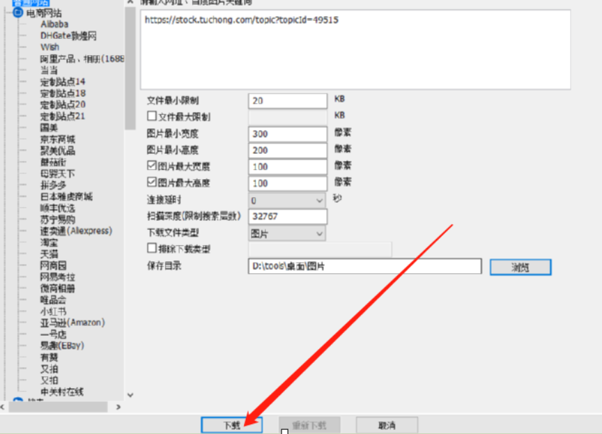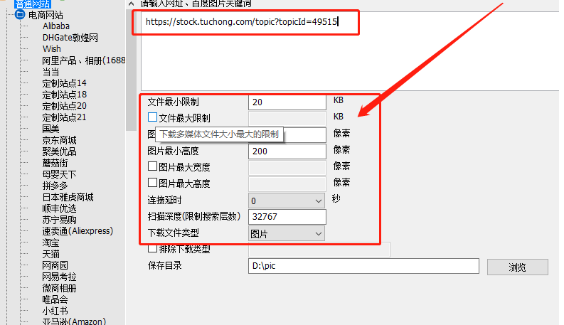 2.输入下载图片的网址之后,我们就可以在下方对下载图片的一些参数进行设置了,包括文件大小的限制和图片宽度等。
