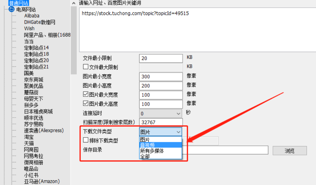 3.点击设置好下载图片的一些权限时候,我们还可以选择下载文件的类型,不仅可以下载图片,还可以下载一些音视频等多媒体文件。