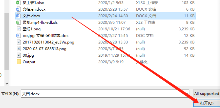 2.点击添加文件之后下一步在出现的选择文件界面中,选中要转换的Word文件之后点击右下角的打开按钮。