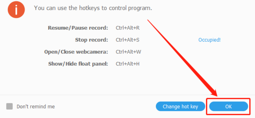 3.点击开始录制按钮之后界面中会出现一个提示界面,向我们展示了录制视频相关的一些快捷键,我们记住之后点击右下角的OK按钮即可。