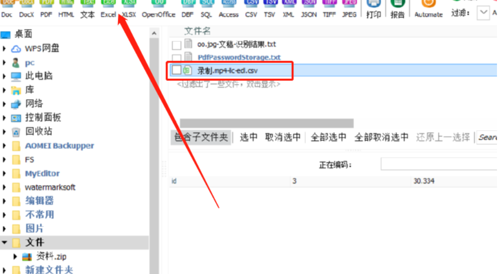 2.选中CSV文件所在的文件夹之后,在界面右边我们就可以看到其中的CSV文件了,然后我们在这个界面的左上方点击Excel这个这个选项,也就是选择将CSV文件转换成Excel文件。