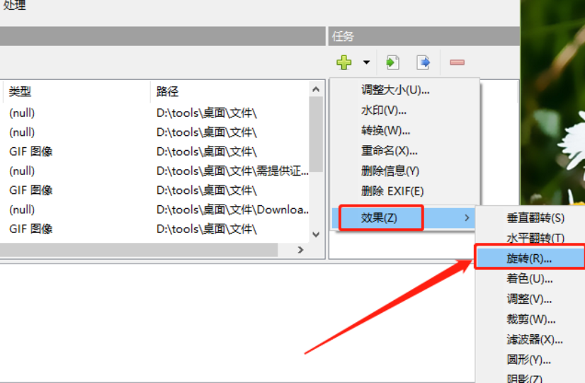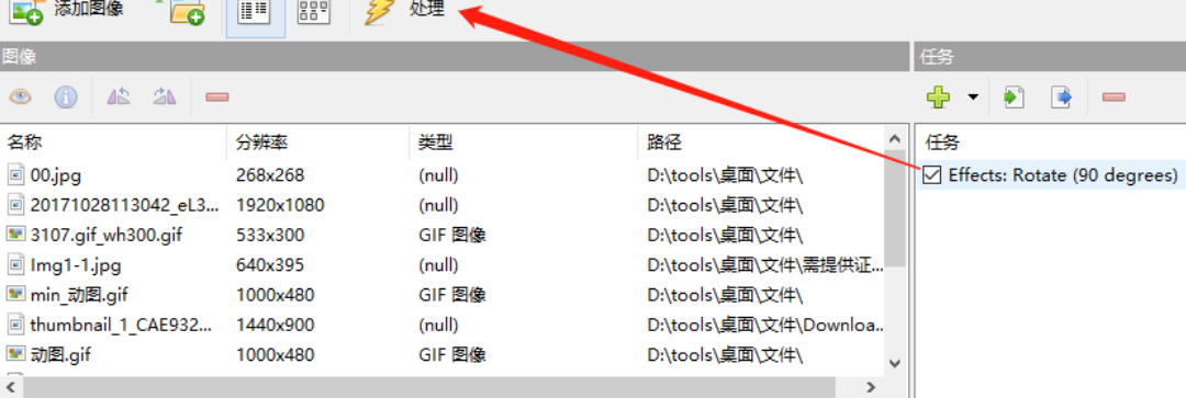 6.点击确定按钮之后这个旋转图片的任务就添加完成了,我们在界面右边看到添加的旋转任务之后点击界面上方的处理按钮即可开始批量旋转这些图片。