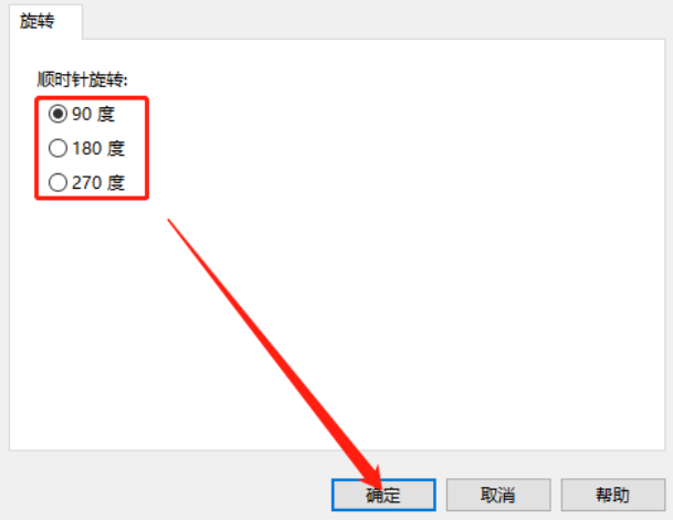 5.点击旋转之后我们将会看到下图所示的界面,在其中可以选择顺时针旋转多少度,根据需求选择之后点击确定按钮。