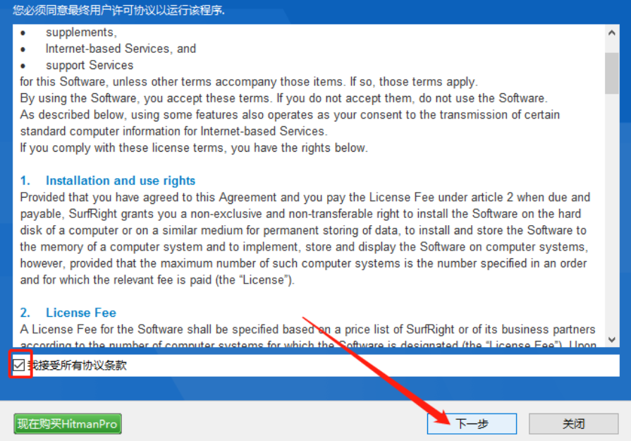 2.进入到扫描恶意程序的功能界面之前会看到下图所示的界面,是一个用户许可协议,我们需要勾选接受所有协议条款选项,勾选之后点击下一步按钮。