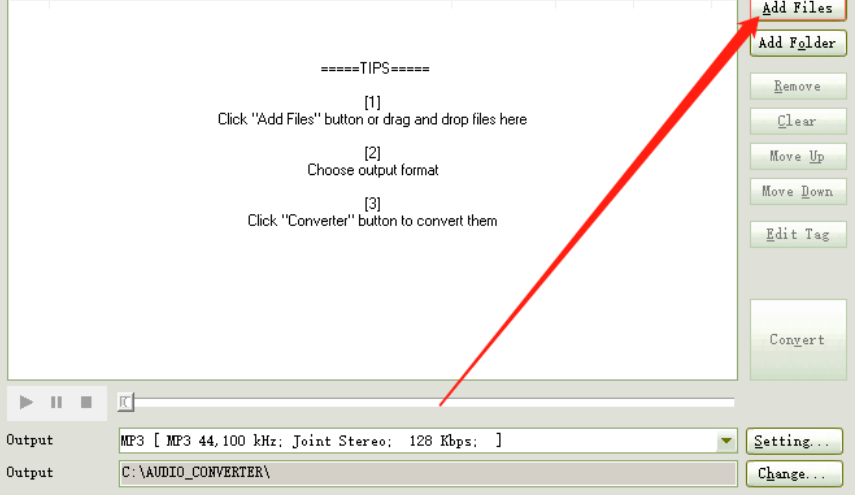 1.首先第一步我们打开软件之后在软件的主界面右上角点击Add Files这个添加文件的功能,点击之后添加要转换的音频文件。