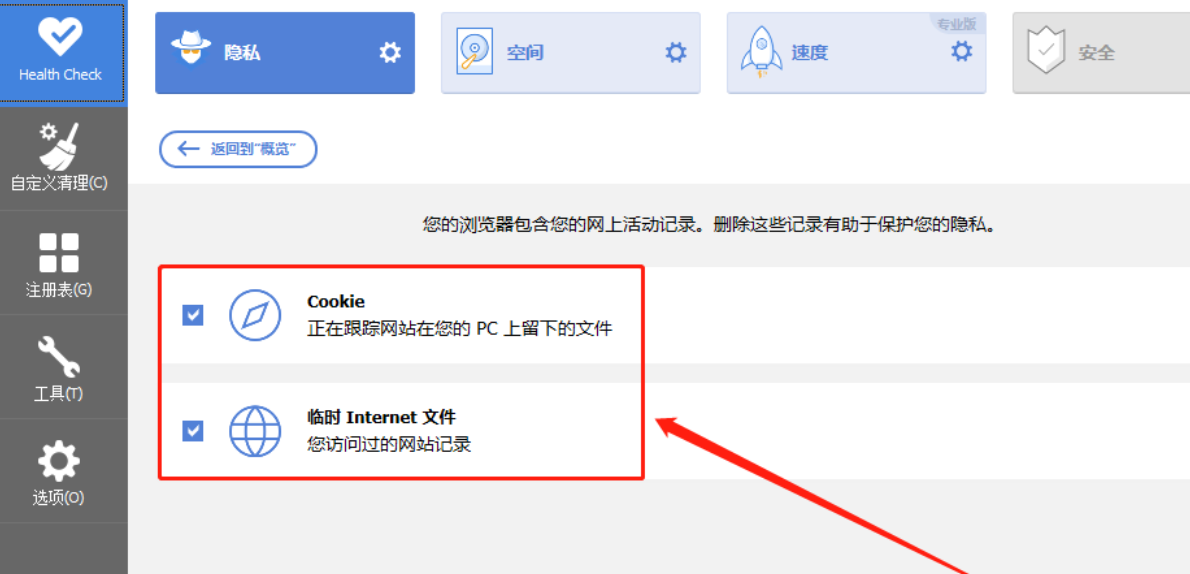 4.点击进入到隐私数据查看界面之后,我们可以看到电脑上扫描出来的一些残留的隐私数据类型,如下图中所示。