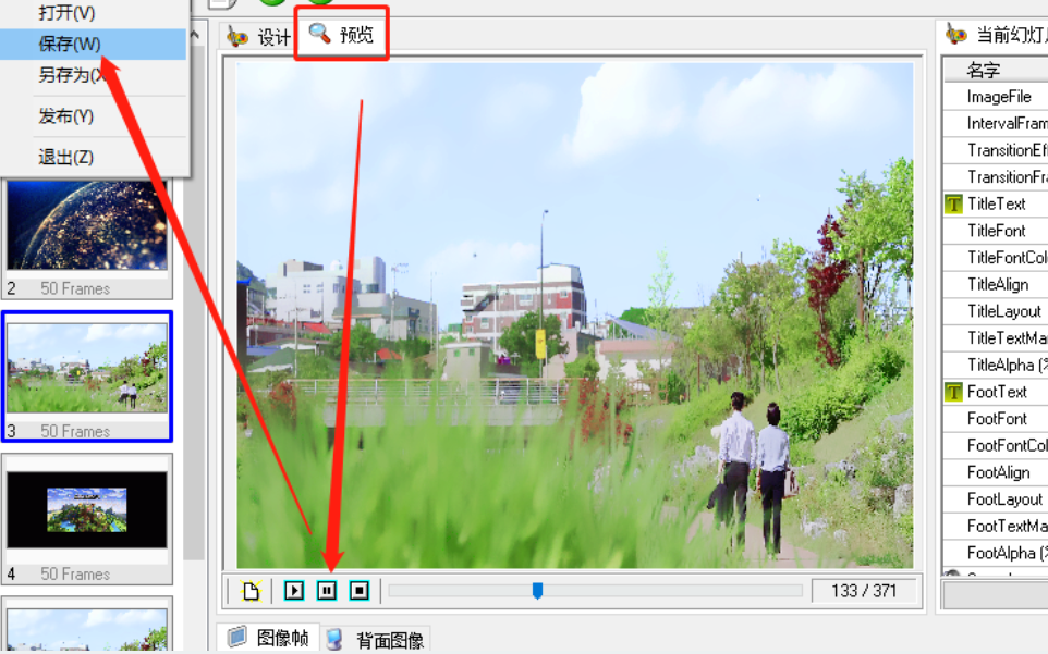 5.设置完成之后我们在界面上方可以点击预览按钮来预览幻灯片的效果,预览效果满意之后点击文件,在出现的选项中选择另存为并点击。