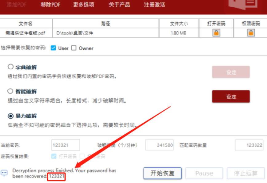 使用上述教程中的操作方法我们就可以通过PDF密码恢复工具这款软件来破解PDF文件的密码了,有需要的朋友赶紧试一试小编分享的方法吧,希望这篇方法教程能够帮助到大家。