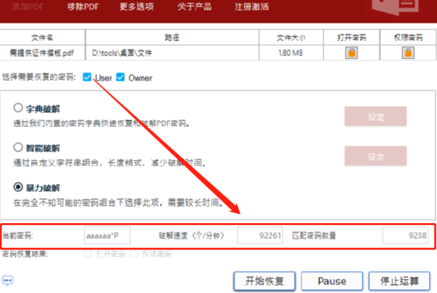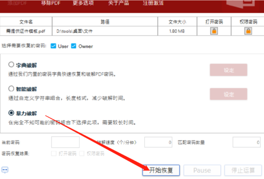 4.如果用户完全不知道密码的组合的话,就可以选中暴力破解模式,然后点击下方的开始恢复这个功能按钮就可以开始暴力破解PDF密码了。